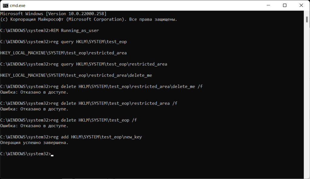 When running with regular user privileges, we can list that key, but we can’t delete it, its parent or even the HKEY_LOCAL_MACHINE\SYSTEM\test_eop key (the reg command prints the Access denied error).