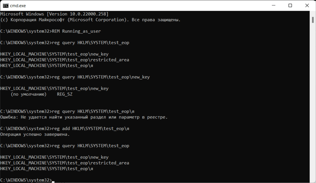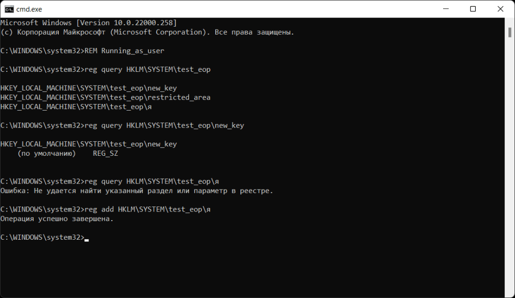 And the HKEY_LOCAL_MACHINE\SYSTEM\test_eop\я key can be listed, but can’t be opened (the reg query command prints the Cannot find error).