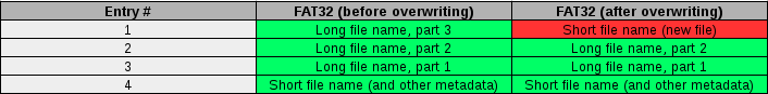 When new entries are allocated (in the example shown above, a file with a shorter name is created, so it uses one file name entry instead of two), they can go to the beginning of the array of directory entries (overwriting previously deallocated directory entries). So, a deleted file loses its critical metadata (its attributes, timestamps, data size, first cluster, etc.), but some of its file name entries can survive!
