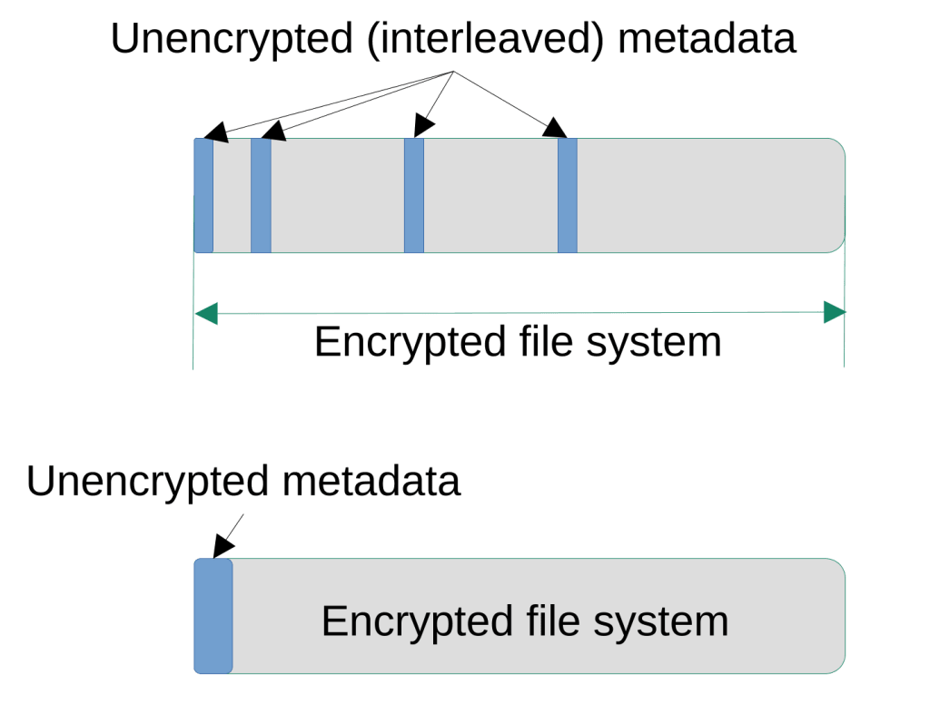When the interleaved storage is used, encryption metadata (marked in blue) is stored somewhere in the area designated for the encrypted file system (marked in grey). These locations can be accessed by reading data blocks from the mounted (unlocked) encrypted file system, but they are represented by the encryption driver as containing null bytes only (it makes no sense to actually decrypt plaintext metadata using a volume key). Additionally, these metadata areas are marked as allocated in the encrypted file system, so they can’t be overwritten by filling it with files.