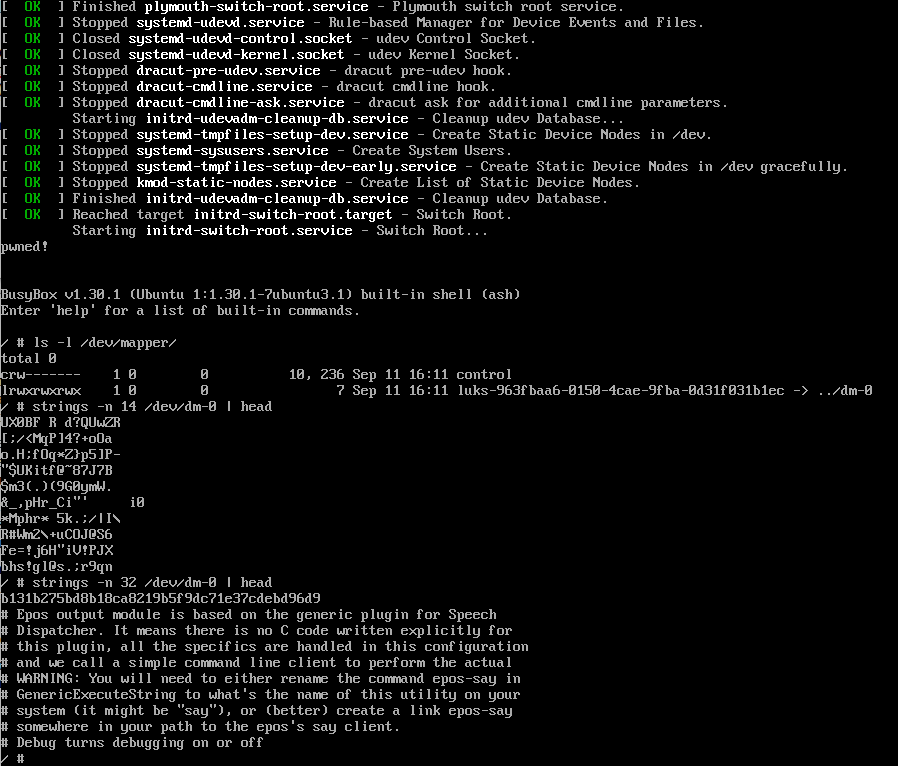 - In the first example, dracut (a set of programs for the initial RAM file system used to boot Linux-based operating systems) picks a wrong, unencrypted, attacker-controlled file system (on an attached external drive) to continue the boot and starts the init program from it, while the encryption key is in memory.