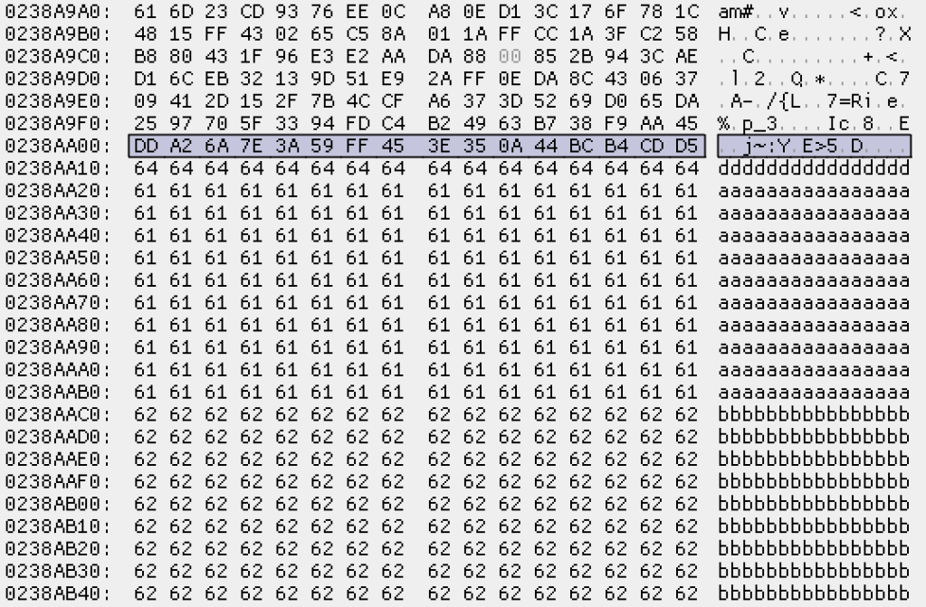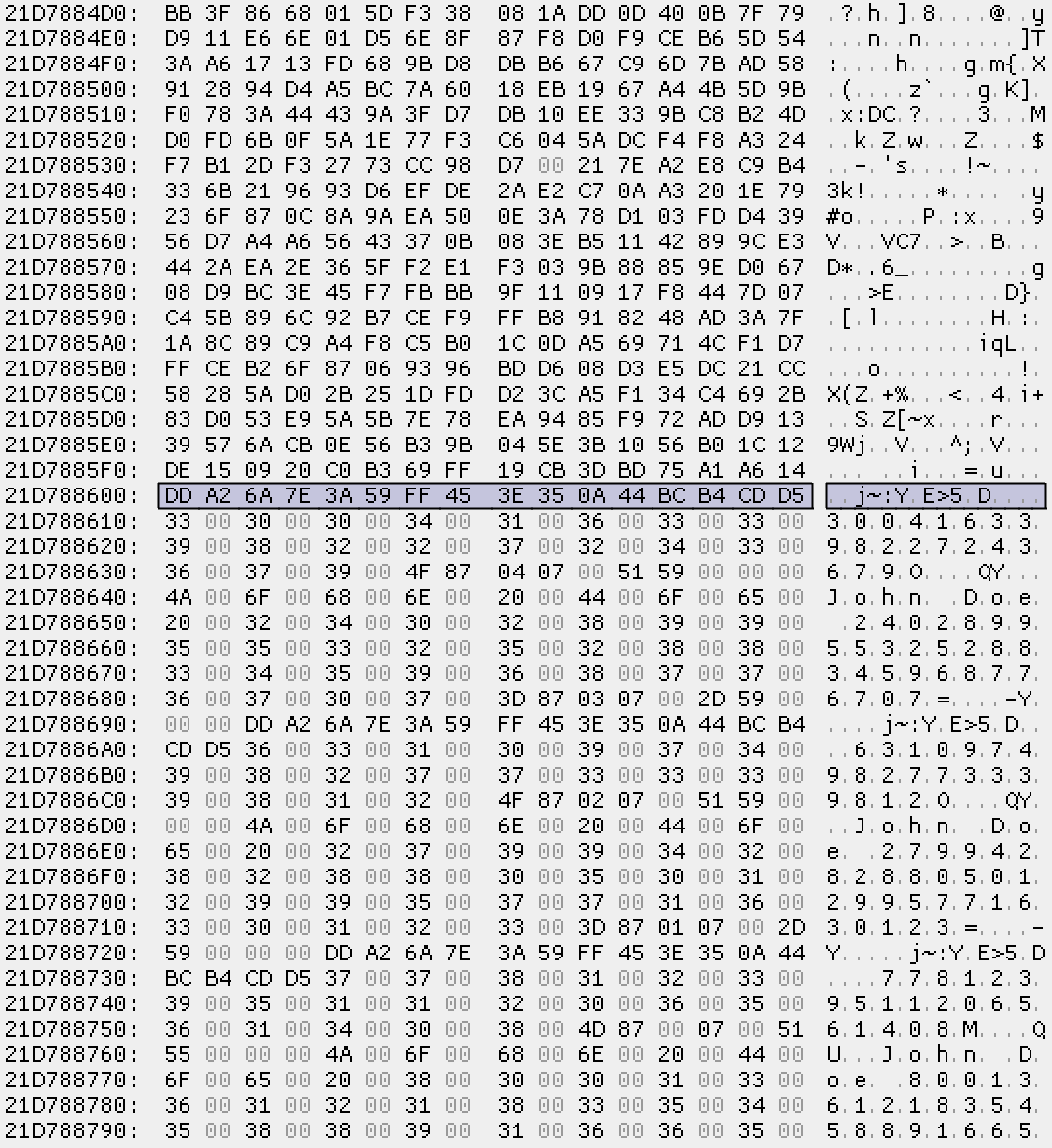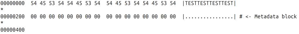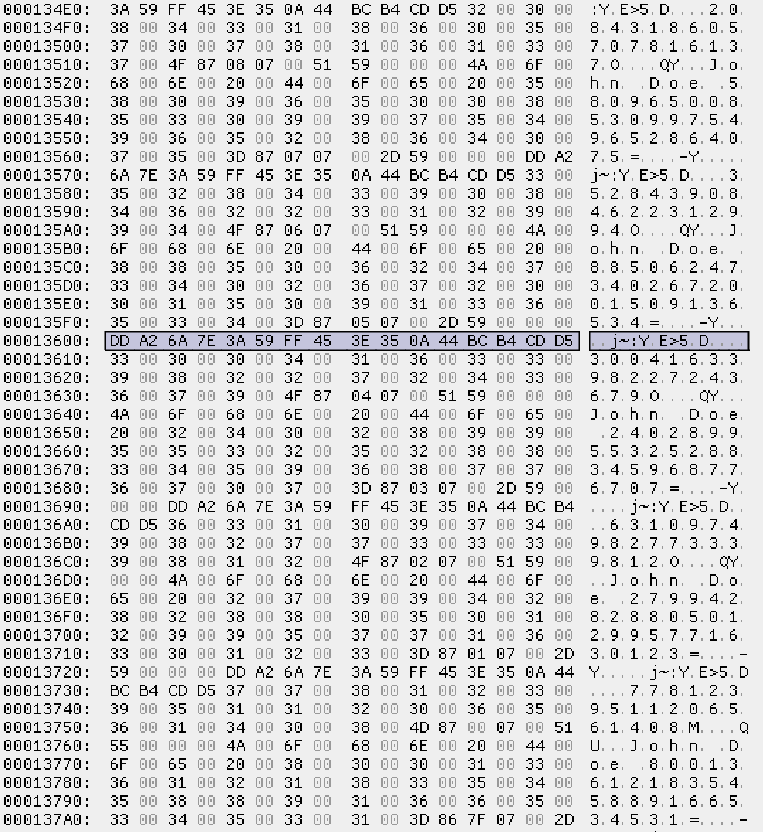 Finally, if an attacker can spray these 16 bytes into a database (e.g., by repeatedly inserting rows or documents containing this byte pattern through a public-facing web application running on an FDE-enabled server), it’s possible to leak nearby database records (located within the same sector) to the drive in the plaintext form (just like this: an SQLite3 database file using UTF-16LE, this file as stored on the disk).