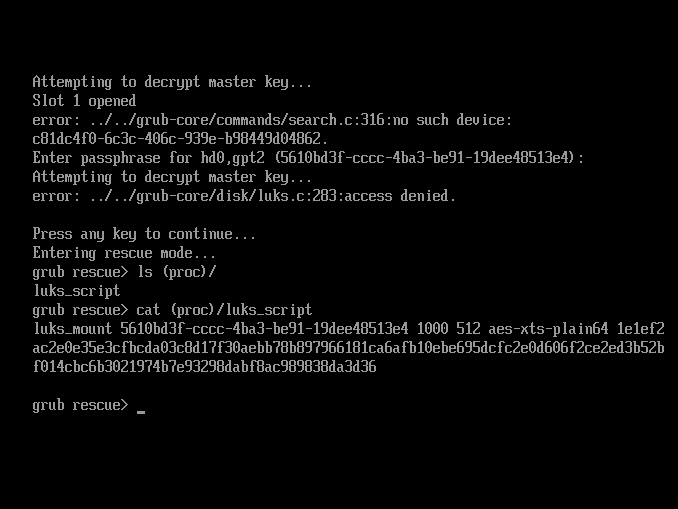 - In the second example — CVE-2025-4382, GRUB (a boot manager, which is more an operating system than a boot loader) spawns its rescue shell while the encryption key is in memory and can be easily displayed (via the cat command).