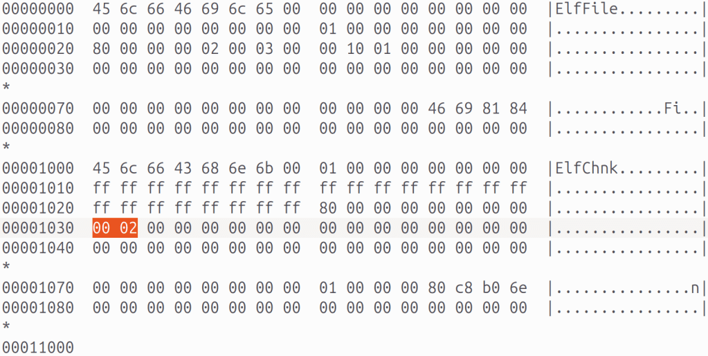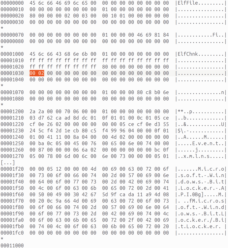 - In the after state, the file has this data (again, the file has no allocated log entries, but you can see some remnant data after the ElfChnk signature):