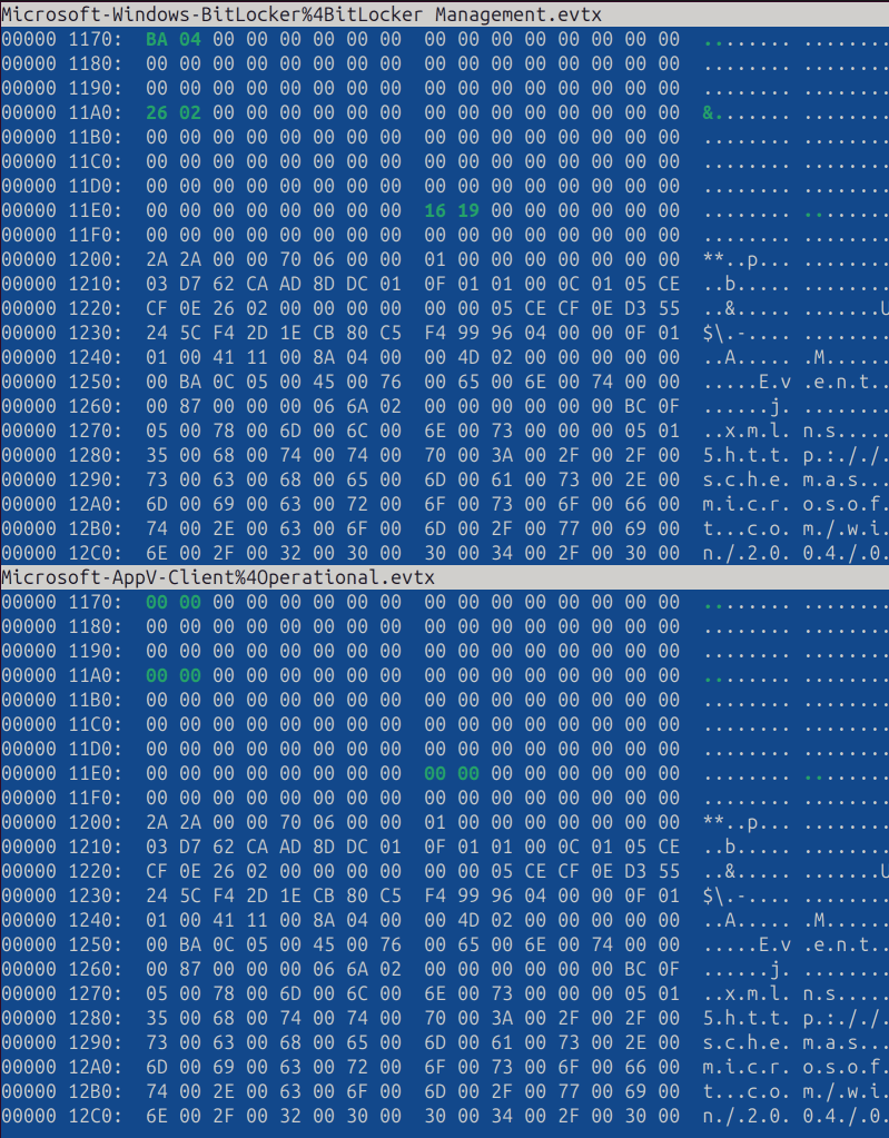 Here is the difference between these two files, showing that data is identical starting from 0x1200 bytes (but the Microsoft-AppV-Client%4Operational.evtx file has less non-zero bytes):